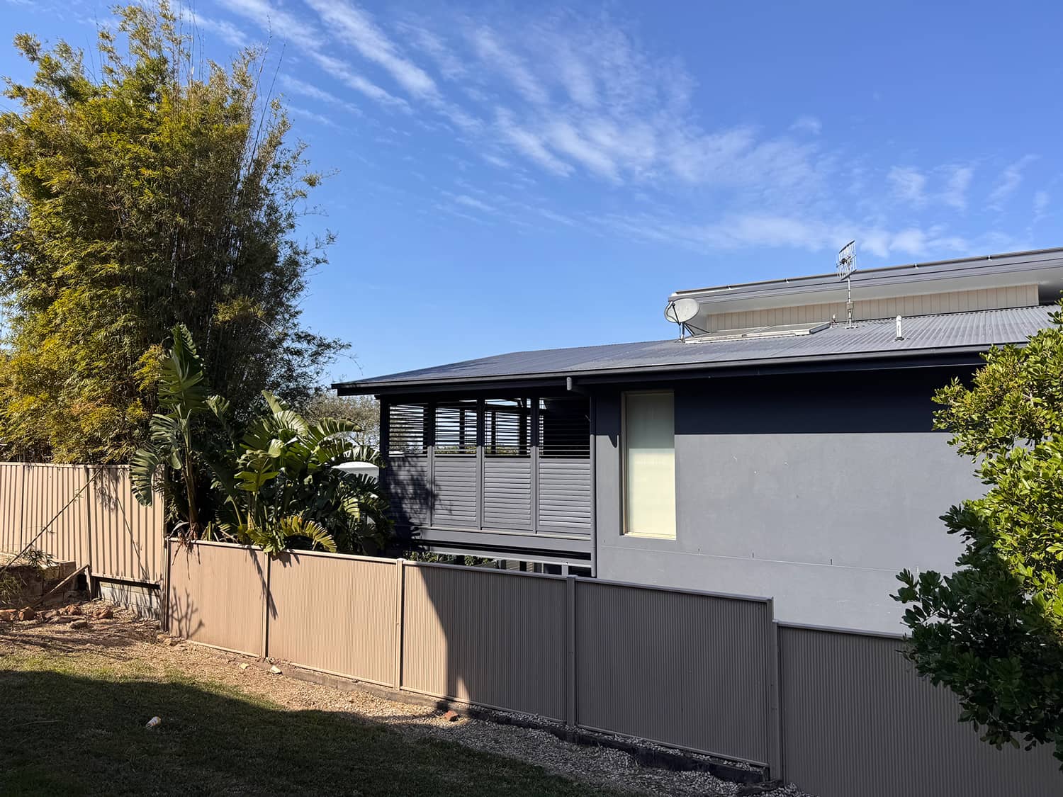 Bold dark blue exterior with second storey addition and expansive decking.